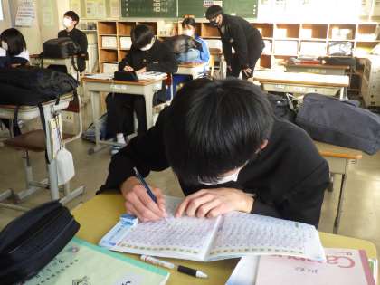 入試に向けての勉強や面接練習に取り組んでいました。私立高校の推薦入試を受験した生徒たちが、いろいろとアドバイスをしている姿が印象的でした。