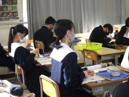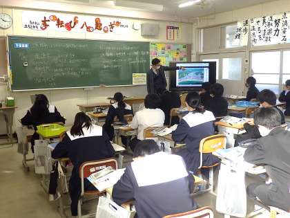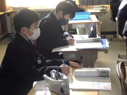 「源頼朝はどのように国を治めていったか」を課題に学習が進められていました。大量に書かれる黒板のことばを必死にノートに写していきます。また、教科担任の話を聞き逃さないようにと真剣に聞いてい様子が印象的でした。