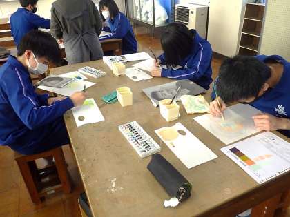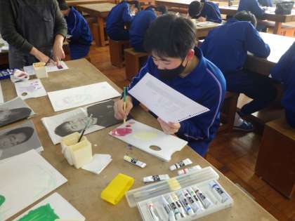 明暗分割の技法を使った自画像のイラストづくりです。配色の計画を立て、いよいよ着色です。教室中は静まり返り、全員がもくもくと活動に取り組んでいます。途中、いままでの学習の成果が非常によく表れていると教科担任が褒めていました。