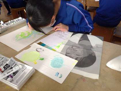 明暗分割の技法を使った自画像のイラストづくりです。配色の計画を立て、いよいよ着色です。教室中は静まり返り、全員がもくもくと活動に取り組んでいます。途中、いままでの学習の成果が非常によく表れていると教科担任が褒めていました。