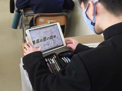 自然教室中に先生たちが見つけた生徒の頑張りが、スローガンの横断幕に所狭しと書き込まれています。(タブレットの画面がそれです)