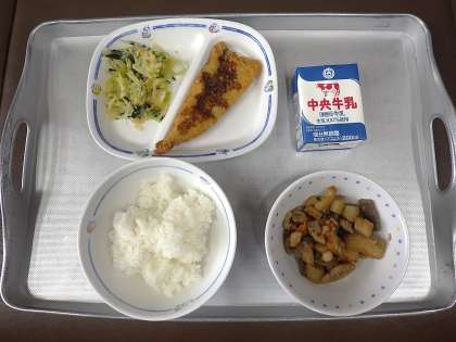 今日の献立は、筑前煮、アーモンドあえ、にぎすフライ、ごはん、牛乳 でした。  エネルギー:804kcal