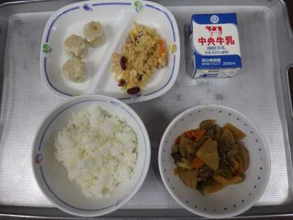 今日の献立は、根菜と豚肉の韓国風煮、切干しだいこんと豆のさっぱりサラダ、えびしゅうまい、ごはん、牛乳 でした。 エネルギー:819kcal