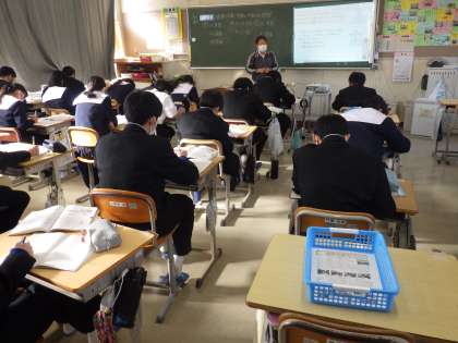 「直線と平面、平面と平面の位置関係」について学習が進められていました。個人で考えた後、仲間と解答の確認、解き方のヒントやアドバイスを伝え合っています。