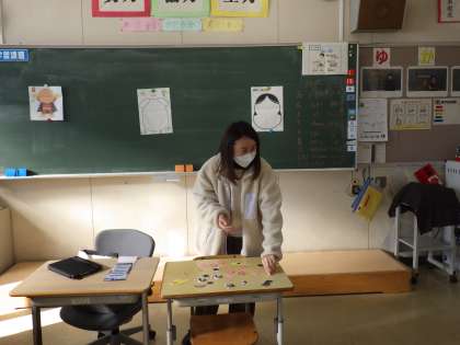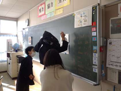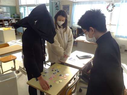 上下左右、顔の各パーツなど簡単な英単語を確認したあと、目隠しをしている仲間に英語で指示を出し、キャラクターの顔を作っていきます。
