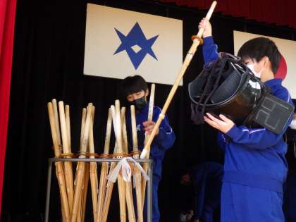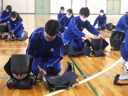 今日はこれまで学習してきた垂れや胴の着脱を復習しつつ、面の着脱の仕方を学んでいました。目に見えない部分でのひもの長さの確認や結び方に苦労していましたが、仲間の協力もあり、何とか初めての面付けの授業をクリアしていました。