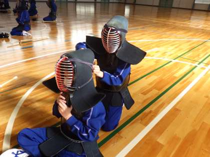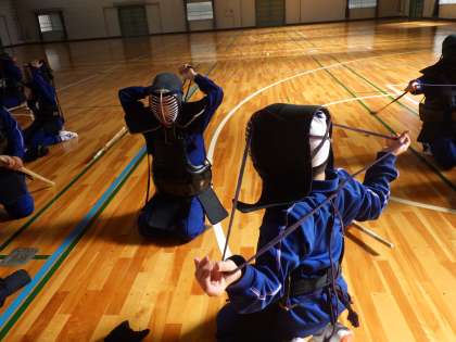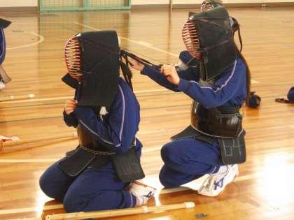 今日はこれまで学習してきた垂れや胴の着脱を復習しつつ、面の着脱の仕方を学んでいました。目に見えない部分でのひもの長さの確認や結び方に苦労していましたが、仲間の協力もあり、何とか初めての面付けの授業をクリアしていました。