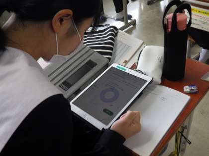 「標本を抽出する方法を知ろう」という課題で学習が進められていました。中学校3年間で学習する最後の単元でもあります。学習用タブレットで演習問題も解きながら、感慨深げに授業に臨んでいるようでした。