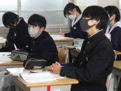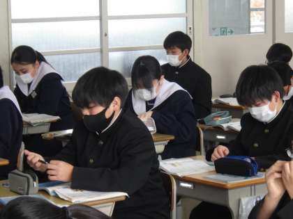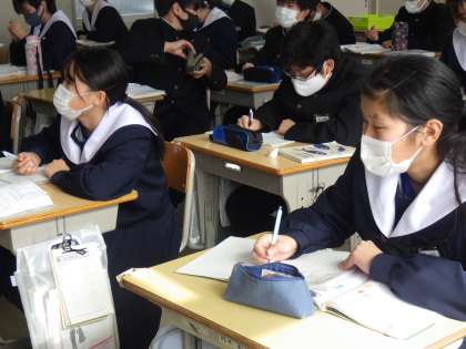 「立体の構成を知ろう」を課題に学習が進められていました。平面の図形が回転するとどんな形になるかをイメージしながら問題にあたっていきます。