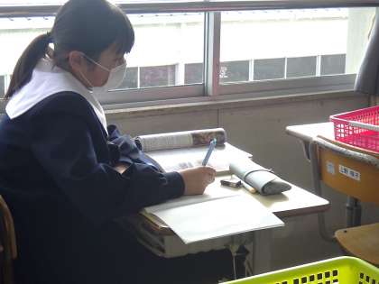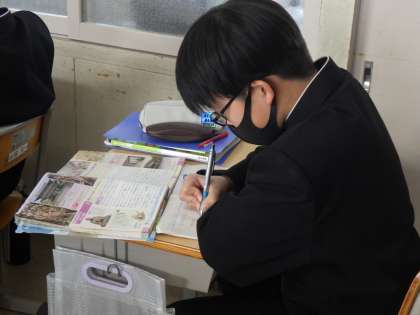 鎌倉時代の文化や宗教について学んでいました。学習診断テストや学年末ストが間近に迫っていることもあり、いつも以上に集中して学習に取り組んでいるように感じました。
