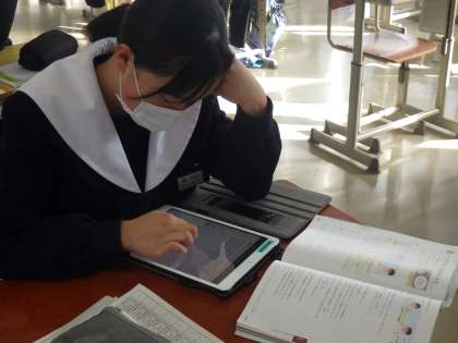 中学校生活で最後の単元の学習です。「データを活用しえ問題を解決しよう」を課題に授業が進められていました。教科担任への積極的な質問、仲間同士の教え合いはもう当たり前。学習用タブレットを用いて一人でも学習を進めていきます。