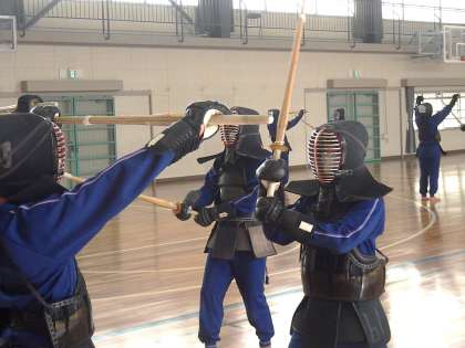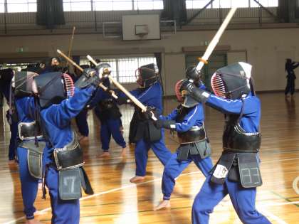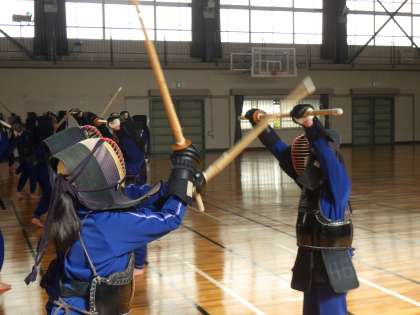 体育館の空気の冷たさに加え、床からの足の冷たさにも耐えながらの授業でした。しっかりと防具をつけることができ、フル装備での稽古がいよいよ始まりました。