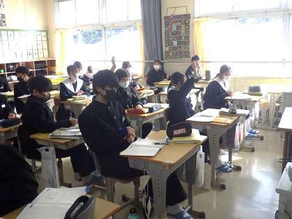 昨日は、ALTとのコミュニケーション活動の日でした。ALTが英語の物語を読み上げ、教科担任がその内容について質問していきます。間近に迫った学習診断テストのリスニング問題への対策としても役立っています。