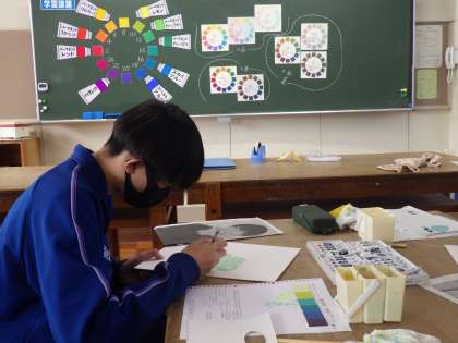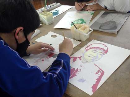 明暗分割の技法を使って、自画像のイラストづくりに取り組んでいました。自分で決めたイメージの色を1色ずつ増やしていくたびに、自分の姿が浮かび上がってきます。細かな筆遣いは本当に大変そうですが、作品が次第に完成に近づいてくる様子にやる気が増し、集中力を切らさずに取り組んでいるように見えました。