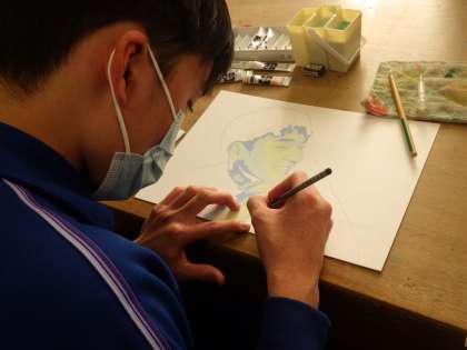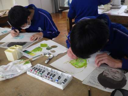 明暗分割の技法を使って、自画像のイラストづくりに取り組んでいました。自分で決めたイメージの色を1色ずつ増やしていくたびに、自分の姿が浮かび上がってきます。細かな筆遣いは本当に大変そうですが、作品が次第に完成に近づいてくる様子にやる気が増し、集中力を切らさずに取り組んでいるように見えました。