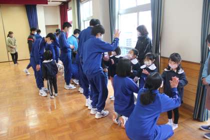 別れのあいさつとお礼を述べ、いよいよ学校へ…。と思わせて、最後に再び園児のところに駆け寄ります。