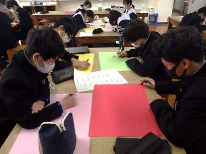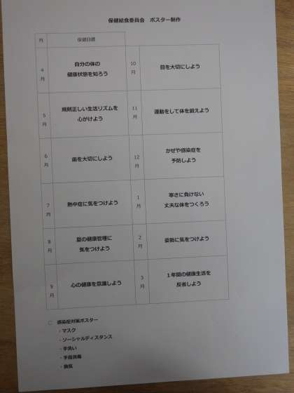 感染対策への呼びかけなどを行い、日頃から活動の多い保健給食委員会。今回はすでに来年度の各月の保健目標を示す掲示物づくりに取り組んでいました。