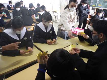 今日はALTとのコミュニケーション活動の日でした。グループを作り、配付された単語カードには「現在形・過去形・現在進行形」の動詞がプリントしてあります。一つの動詞で3つの形がそろったら、机の上の小物(今回は消しゴム)を取っていきます。最初にそろった人が小物を取ると、それに反応してほかの生徒も小物を取ります。小物が取れなかった生徒が負けとなるゲームです。
