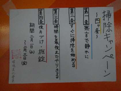 昨日から始まった「掃除キャンペーン」。環境美化委員会が中心となって進めてくれています。大掃除の時期ではありませんが、卒業に向けて学校を少しずつきれいにしていこうという取組になります。今回は特に “掃除に向かう姿勢” に意識を向け、キャンペーンが行われています。