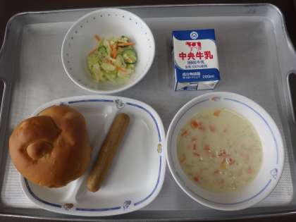 今日の献立は、ポタージュスープ、コールスローサラダ、ウインナー、りんごパン、牛乳 でした。 エネルギー:791kcal