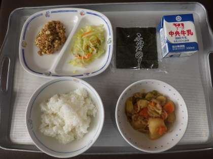 今日は「豊田ブランドの日」献立ということで、肉じゃが、甘酢あえ、納豆巻き、ごはん、牛乳 でした。  エネルギー:884kcal