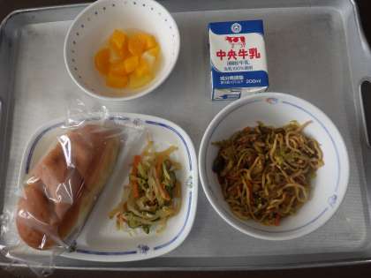 今日の献立は、焼きそば、ナムル、ミックスフルーツ、米粉パン、牛乳 でした。  エネルギー:790kcal