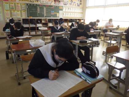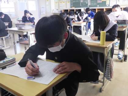 入試対策のテストが行われていました。私立高校の合格通知を手にしている生徒も、気を抜かずに取り組んでいます。公立高校の受検を控えている仲間と一緒に、“みんなで乗り切る意気込み” が感じられました。