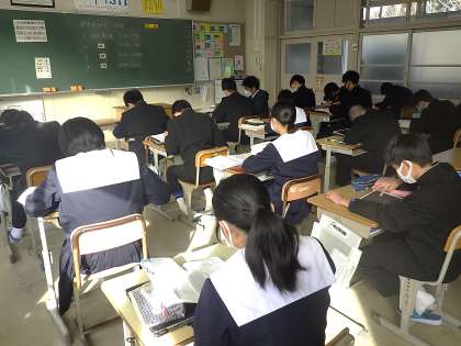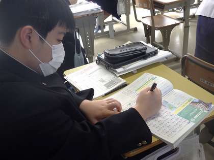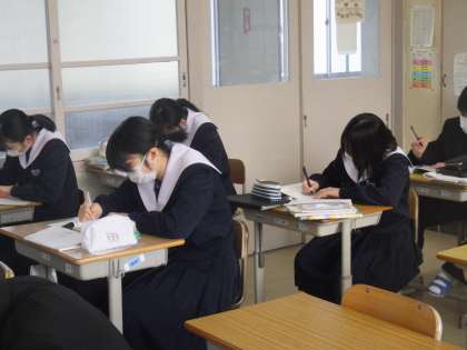 写真は、直前のテスト勉強に励む2年生の様子です。今日のテスト教科は、国語・数学・音楽。それぞれが落ち着いてテストに臨めるよう、教科を選び、時間を区切ってしっかり勉強していました。