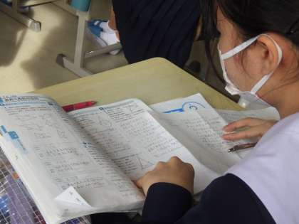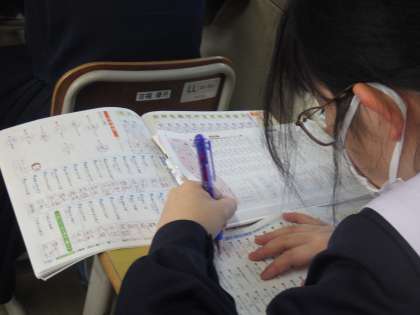 写真は、直前のテスト勉強に励む2年生の様子です。今日のテスト教科は、国語・数学・音楽。それぞれが落ち着いてテストに臨めるよう、教科を選び、時間を区切ってしっかり勉強していました。