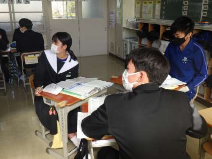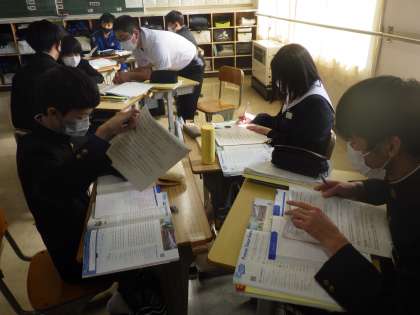 質問される事柄について、正しい英文で答えていくため、グループで話し合いをしながら、正解にたどりつこうと努力しています。