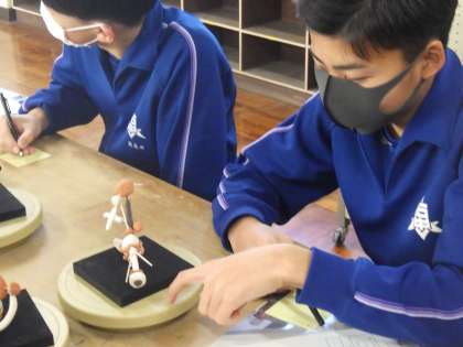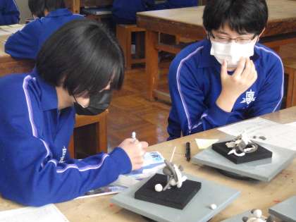 前回の授業で制作した粘土を使っての抽象彫刻の作品の鑑賞が行われていました。仲間の作品を見た感想や新たなアイデアなどを付箋に書きこみ、渡していました。これから始まる作品づくりに向けてのヒントが得られるはずです。