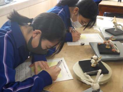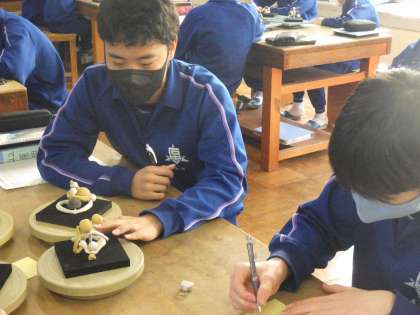 前回の授業で制作した粘土を使っての抽象彫刻の作品の鑑賞が行われていました。仲間の作品を見た感想や新たなアイデアなどを付箋に書きこみ、渡していました。これから始まる作品づくりに向けてのヒントが得られるはずです。