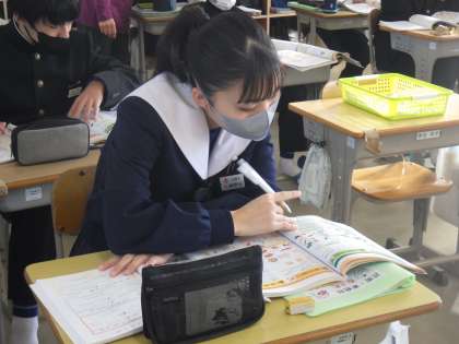 6つの基礎食品群について学び、日頃食べているものがどこに属しているか分類していました。「成長期」といわれる今、意識して食べたいものと、将来、病気にかからないために意識して食べていきたいものをしっかり学んで、日頃の食事に生かしてほしいと思います。