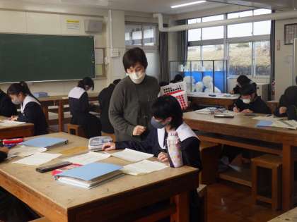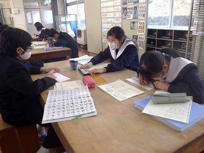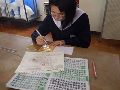 オノマトペの作品づくりで、イメージ通りに出来上がった下絵を画用紙に描き込んでいました。文字の大きさや全体のバランスなどを考え、定規でしっかりと測っていました。頭を悩ます活動から、丁寧に作り上げる活動に移っていきます。