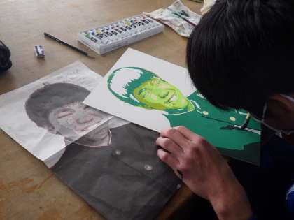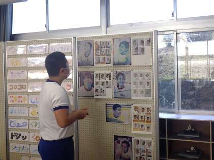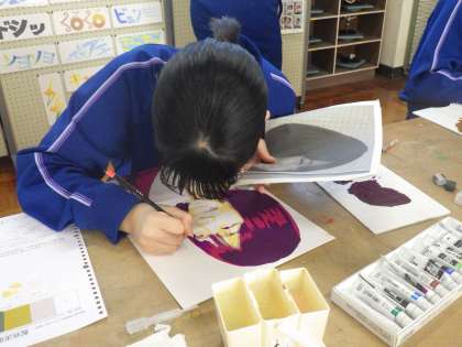 明暗分割の技法を使った自画像のイラストづくりです。細かな部分まで丁寧に塗り上げ、背景のデザインに取りかかっている生徒もいました。作品を良さをさらに引き出すため、サンプル作品などからアイデアを練っていきます。