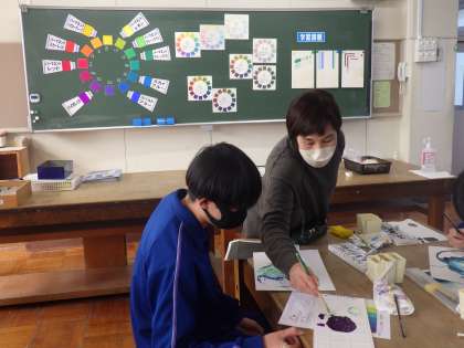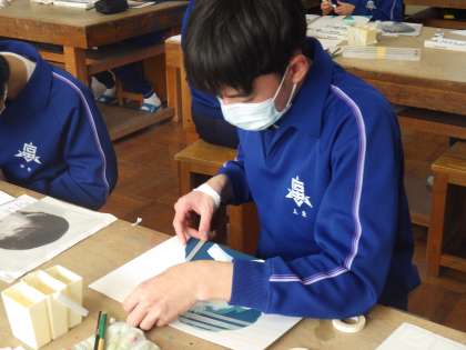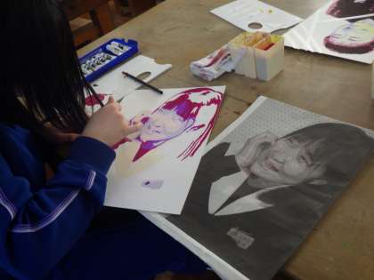 明暗分割の技法を使った自画像のイラストづくりです。細かな部分まで丁寧に塗り上げ、背景のデザインに取りかかっている生徒もいました。作品を良さをさらに引き出すため、サンプル作品などからアイデアを練っていきます。