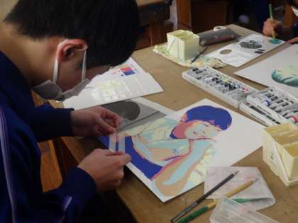 明暗分割の技法を使った自画像のイラストづくりです。細かな部分まで丁寧に塗り上げ、背景のデザインに取りかかっている生徒もいました。作品を良さをさらに引き出すため、サンプル作品などからアイデアを練っていきます。
