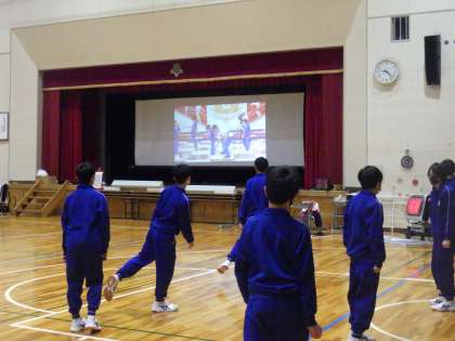武道(剣道)を終え、映像を見ながらリズムダンスを学んでいきます。「体を動かすことは好きだけど、手足が思うように動かない」「かっこよく踊りたいけど、ステップがなかなかマスターできない」などの悩みもあるようですが、あきらめず、繰り返し練習している姿に感心しました。