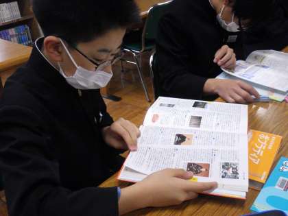 百科事典を使い、日頃疑問に思っている社会科に関する事柄を探していました。気になったページには付箋を貼り、たくさんの疑問を見つけ出していました。今後も図書館を利用して、疑問を仲間と探究する授業を進めていきます。