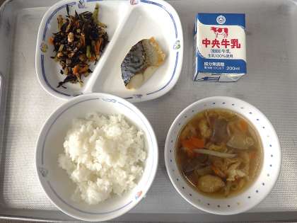 今日の献立は、のっぺい汁、ひじきの炒め煮、さばの塩焼き、ごはん、牛乳 でした。 エネルギー:803kcal
