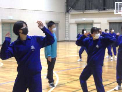 映像を見ながら、振り付けを一生懸命マスターしようとグループで活動していました。難しいステップなども笑顔で取り組んでいるのが印象的でした。