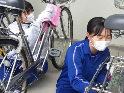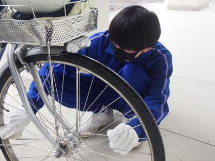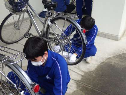 自転車の動力の伝わり方を学習したあと、実際に自転車を触って確認していきます。併せて、3年間通学でお世話になった自分の自転車の整備と磨き上げも行っていました。