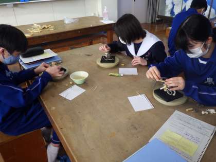 前回の授業でお互いの作品を鑑賞し、アドバイスをし合いました。今日はそのアドバイスを作品に表現していきます。アドバイスからイメージはふくらみますが、それをカタチにしていく作業は大変です。試行錯誤しながら作品づくりに没頭していました。