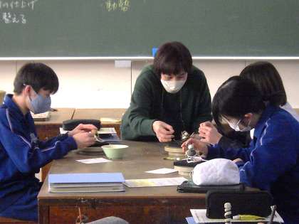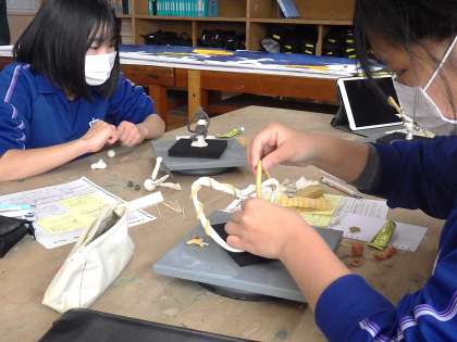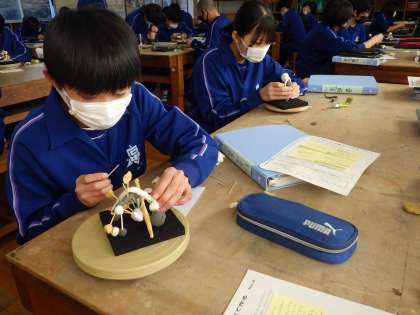 前回の授業でお互いの作品を鑑賞し、アドバイスをし合いました。今日はそのアドバイスを作品に表現していきます。アドバイスからイメージはふくらみますが、それをカタチにしていく作業は大変です。試行錯誤しながら作品づくりに没頭していました。