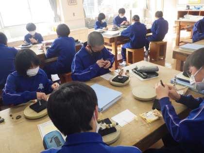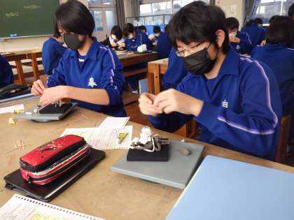 前回の授業でお互いの作品を鑑賞し、アドバイスをし合いました。今日はそのアドバイスを作品に表現していきます。アドバイスからイメージはふくらみますが、それをカタチにしていく作業は大変です。試行錯誤しながら作品づくりに没頭していました。