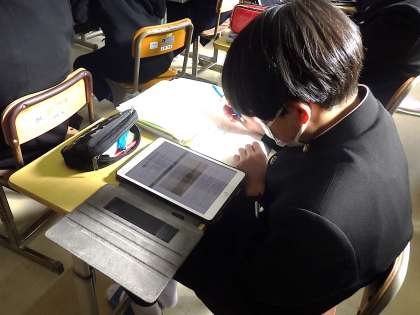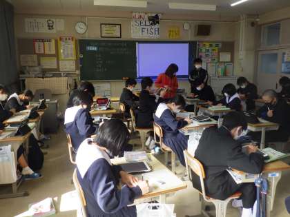 持続可能な社会の実現のために自分にできることを考える学習に取り組んでいました。気候・ごみ・エネルギー・水質・森林資源… いろいろなテーマから一つに絞って、学習用タブレットを活用して、自分にもできることをレポートにまとめていきます。