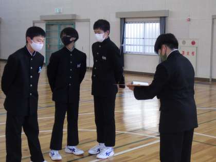 マスク越しにも見える白い息。体育館の空気の冷たさが伝わってきます。しかし、「先輩たちに感謝の気持ちを伝える」という意識があるため、寒さを吹き飛ばす勢いで熱心に練習していました。