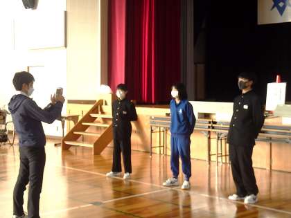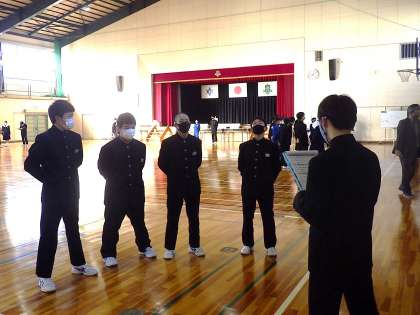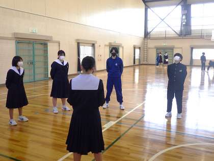 マスク越しにも見える白い息。体育館の空気の冷たさが伝わってきます。しかし、「先輩たちに感謝の気持ちを伝える」という意識があるため、寒さを吹き飛ばす勢いで熱心に練習していました。