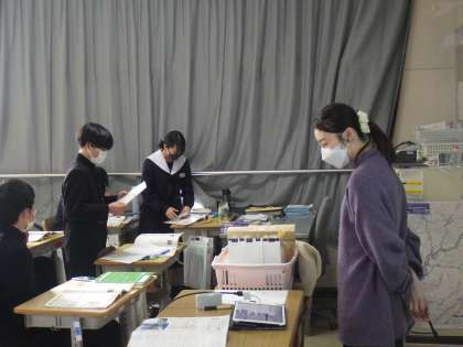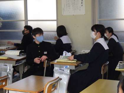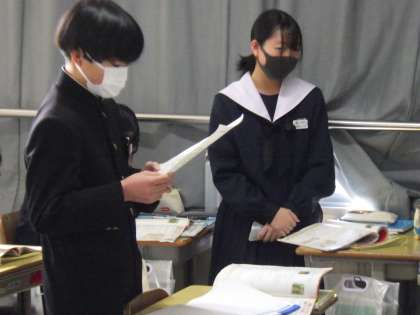 電話での表現の仕方を学んでいました。ペアになり、役割分担をして会話を交わしていきます。プリントを見ながらでしたが、テンポよく仲間と会話文を読み上げて練習していました。