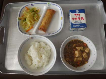 今日の献立は、麻婆豆腐、中華あえ、春巻き、ごはん、牛乳 でした。